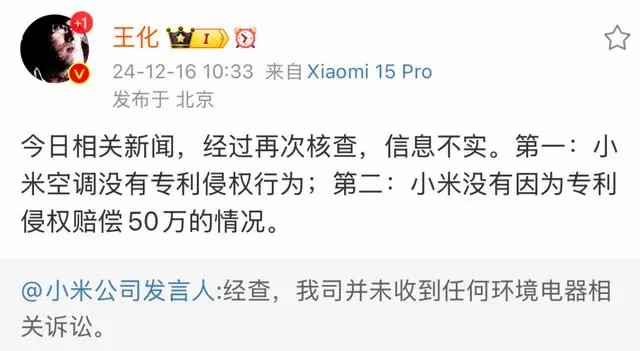 “第一,小米空調(diào)沒有專利侵權(quán)行為;第二,小米沒有因?yàn)閷@謾?quán)賠償50萬(wàn)的情況!蓖趸趥(gè)人微博上如是稱。