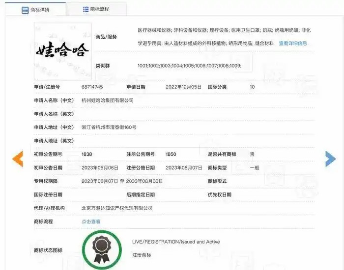 據(jù)記者登錄國家知識產(chǎn)權(quán)局商標局官網(wǎng)查詢發(fā)現(xiàn),此次顯示被轉(zhuǎn)讓的第10類娃哈哈商標,核定使用商品/服務(wù)項目為:醫(yī)療器械和儀器;牙科設(shè)備和儀器;理療設(shè)備;醫(yī)用衛(wèi)生口罩;奶瓶等,該商標專用權(quán)期限自2023年8月7日至2033年8月6日。